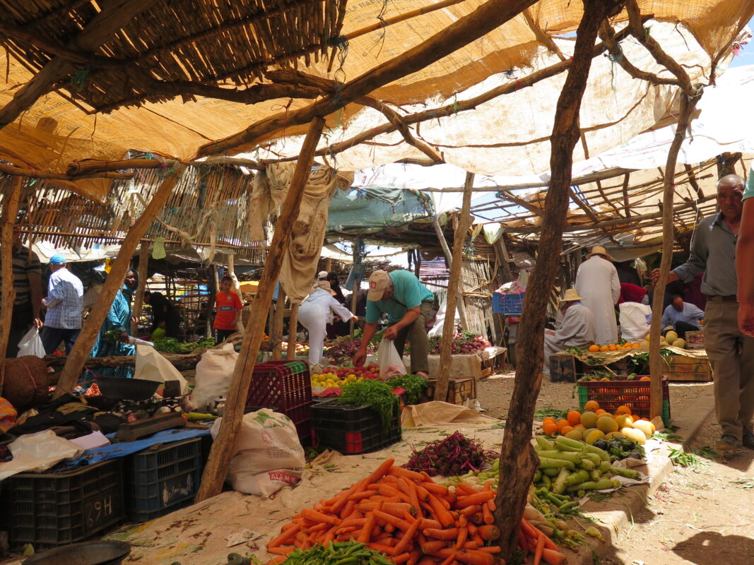 Next to the oily pans are stacks of pottery that look both fragile and unbreakable. Not the kind of decorated ceramics made to appeal to tourists. These pieces are used daily in the kitchens of the area. Simple, terracotta, and functional, they are used to prepare the most flavourful dishes for which Morocco is so well known, and of which dates are an essential ingredient. Accordingly, the markets are flooded with date varieties and vendors generously offer their wares for tasting so you can decide what to buy. Alongside these luxuries, piles of humble vegetables and fruits in green, yellow, purple, and brown paint a portrait of everyday life.